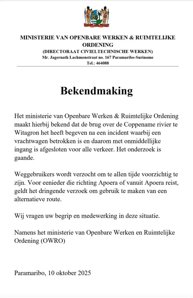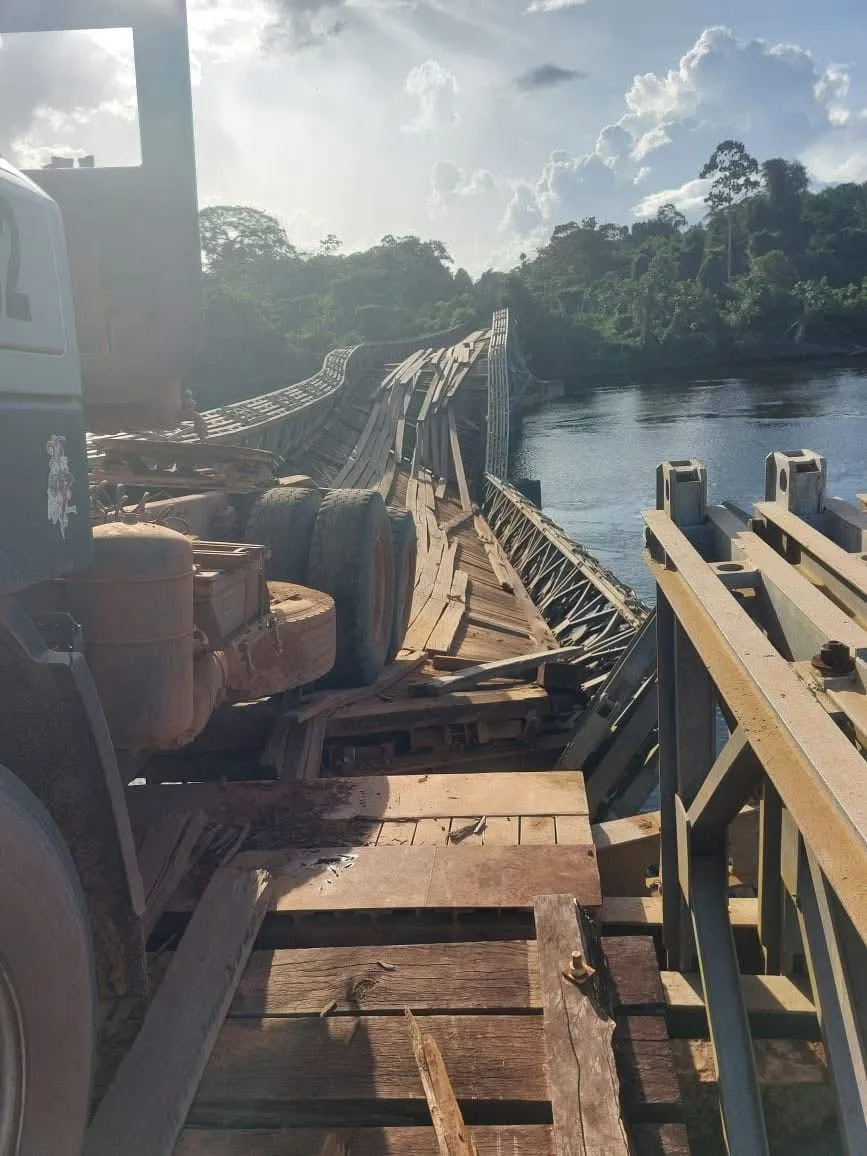 De brug bij Bitagron, over de Coppenamerivier in het district Sipaliwini, is ingestort.