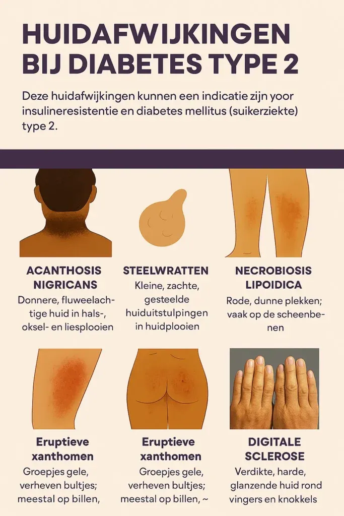 Wat velen niet beseffen, is dat de huid vaak als eerste waarschuwt. Volgens de nefroloog of nierspecialist drs. Subhaas Goerdat zijn huidafwijkingen waaronder: 1) donkerbruine tot zwarte, fluweelachtige verkleuringen (acanthosis nigricans) meestal aan de achter- en zijkant van de hals, in de okselplooien, liesstreek, elleboog- en knieholten, en onder de borsten; 2) kleine zachte huiduitstulpingen die met een steel aan de huid vast zitten (steelwratten) in de hals, oksels, onder de borsten, in de liezen, op de oogleden en soms ook op de bovenrug, onderbuik of dijplooi; 3) rode plekken op de scheenbenen (necrobiosis lipoidica); 4) kleine geelachtige huidbultjes (eruptieve xanthomen) meestal op de billen, de achterzijde van de dijen, ellebogen, knieen en soms op de rug en de armen; en 5) verharding, verdikking en glanzen van de vingers en soms ook tenen (digitale sclerose) mogelijke signalen van insulineresistentie – de voorloper van diabetes.