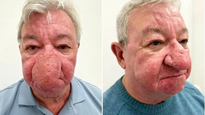 Zes jaar lang zag de 68-jarige Gerard McAliece uit het dorp Kilmalcolm in Schotland zijn neus langzaam uitgroeien tot een groteske vorm, veroorzaakt door rhinophyma, een aandoening waarbij talgklieren overmatig groeien.