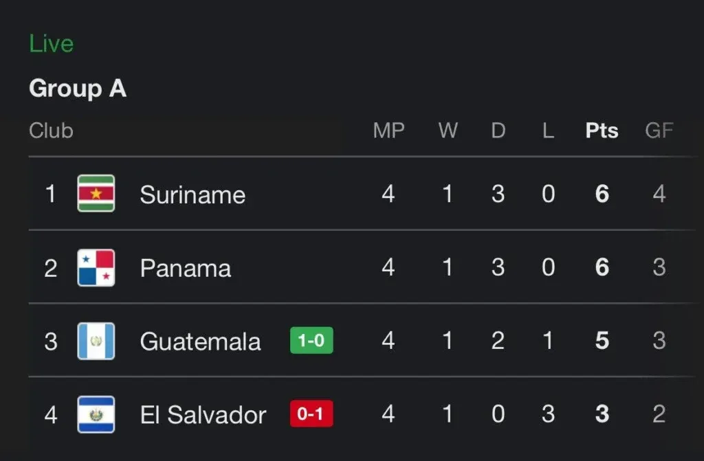 Na vier gespeelde wedstrijden hebben beide landen zes punten, maar Suriname behoudt de leiding dankzij een beter doelsaldo.