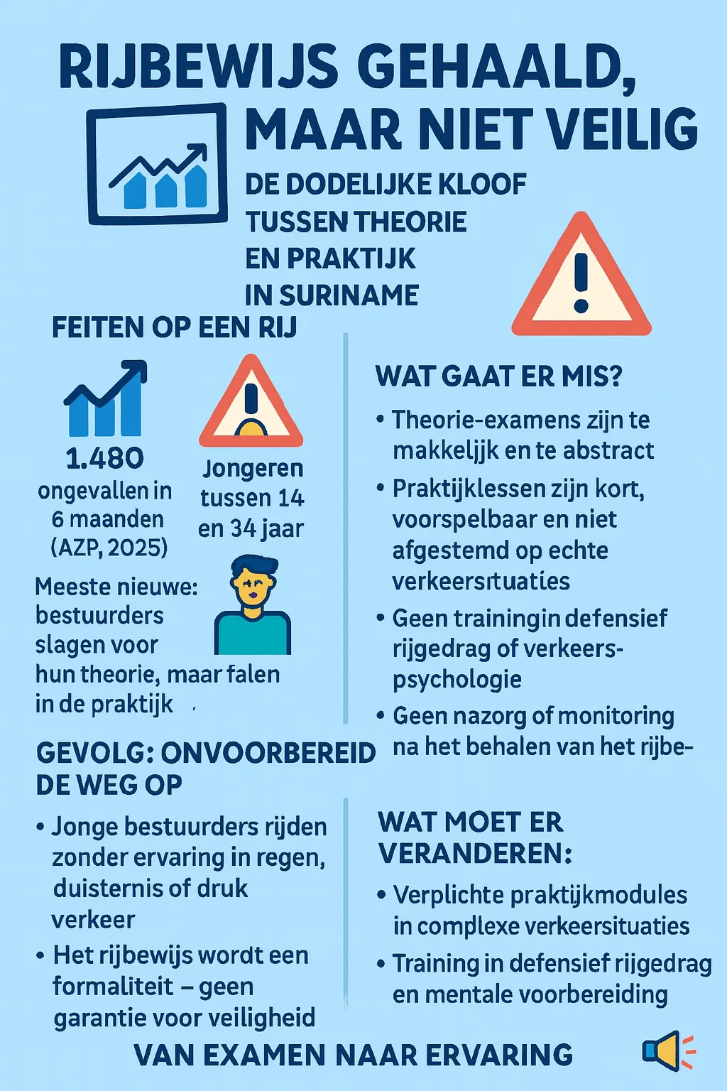 Volgens het VVI (Verkeersveiligheidsinstituut) registreerde het Academisch Ziekenhuis Paramaribo in 2025 al 1.480 verkeersongevallen in zes maanden tijd, waarvan een groot deel jongeren betrof. De cijfers tonen aan dat het behalen van een rijbewijs geen garantie biedt voor veilig rijgedrag.