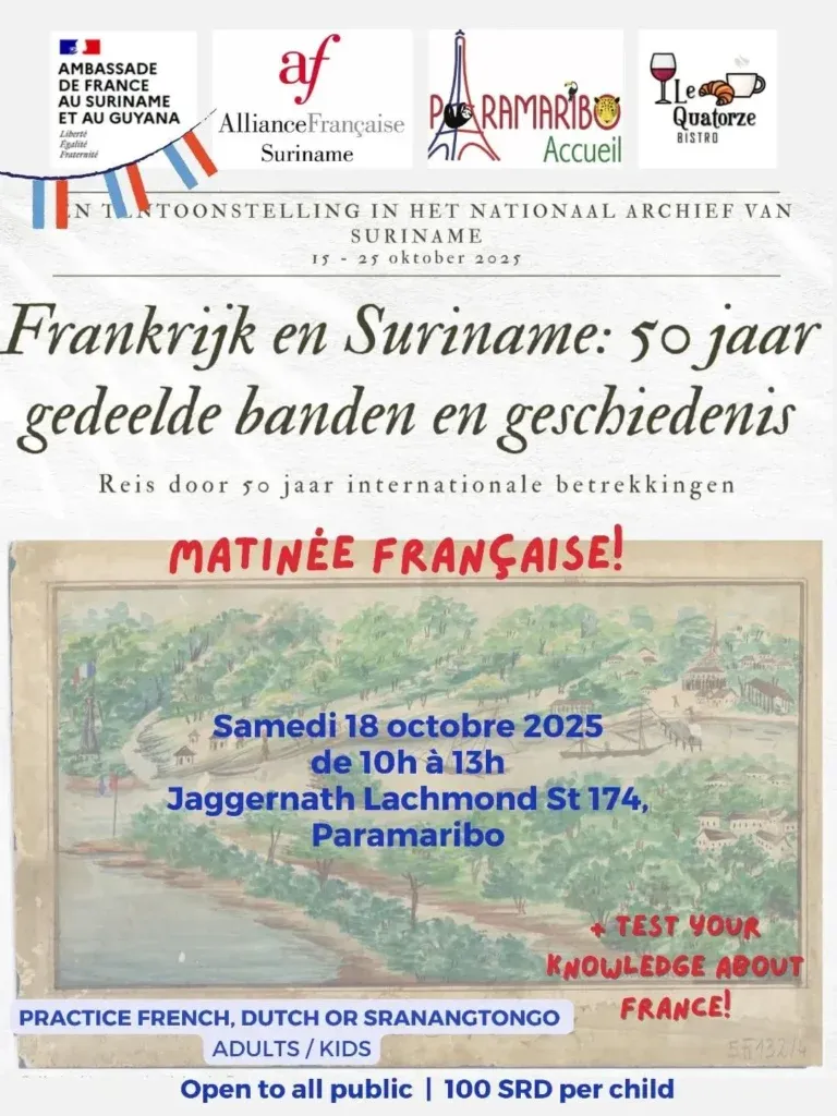 In het kader van Museumnacht en 50 jaar onafhankelijkheid van Suriname, hield het Nationaal Archief Suriname samen met de Franse ambassade zaterdag 18 oktober een bijzondere ochtendactiviteit. De deuren gingen vroeg open voor bezoekers die meer wilden leren over de gedeelde geschiedenis van Suriname en Frankrijk.
