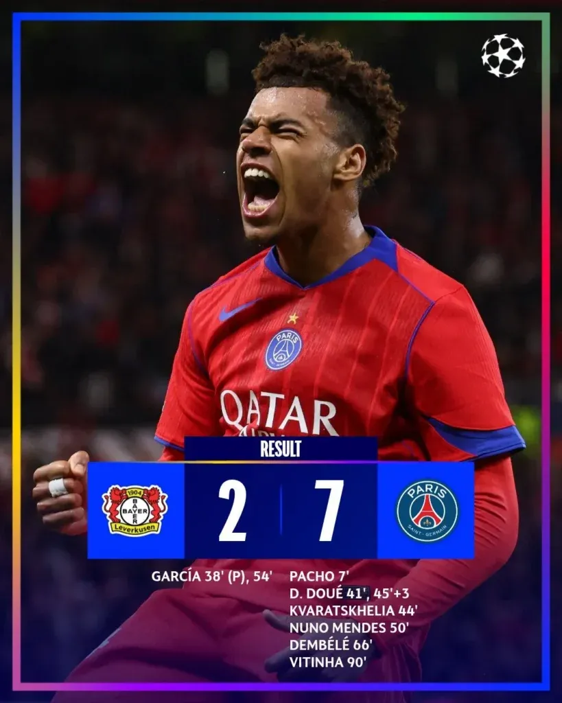 PSG vernietigde Leverkusen met een ongeziene 7-2 en onderstreepte zijn aanvalsmacht.