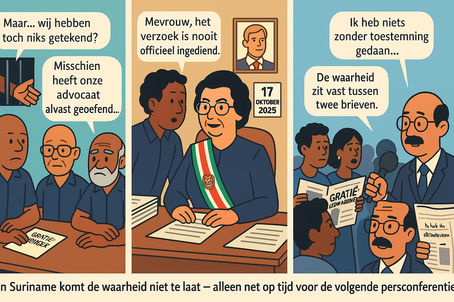 Op 11 oktober 2025 sturen drie gedetineerden uit Santo Boma een brief waarin ze verklaren dat advocaat Irvin Kanhai niet namens hen mocht handelen. Eén van hen ondertekent niet – hij is immers voortvluchtig. Twee dagen later, op 13 oktober, wordt de verklaring publiek. En dan pas, op 17 oktober, houdt de president haar persconferentie waarin ze zegt: “Er is geen verzoek. Punt uit.”