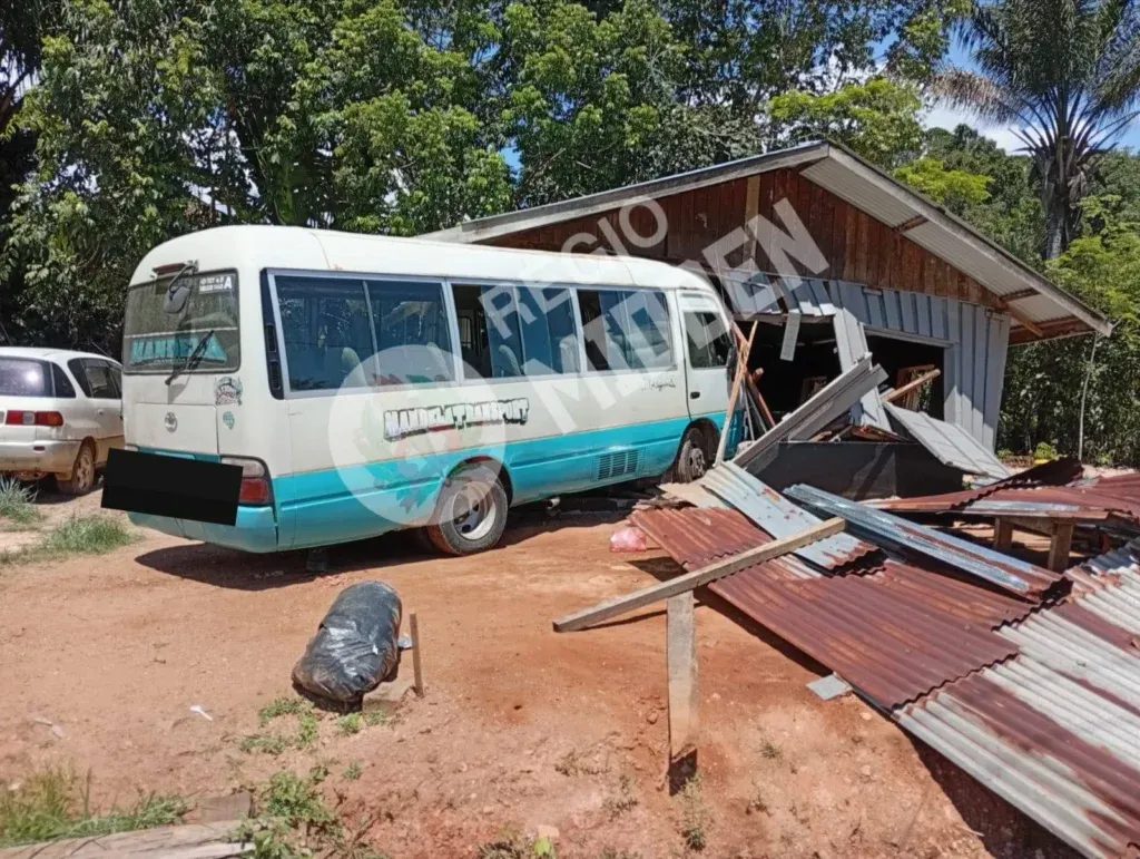 Een personenbus is vrijdagmiddag 24 oktober rond half eenĀ op de Gaama Agbagoweg, Brokopondo, ter hoogte van km 1 van de weg geraakt, op een erf beland en een woning ingereden.