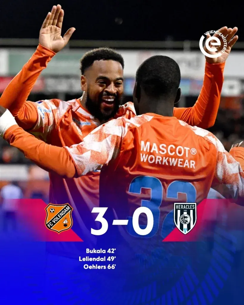 FC Volendam verraste met een overtuigende 3–0 winst op Heracles Almelo, terwijl Sparta Rotterdam thuis met 1–0 won van Telstar.