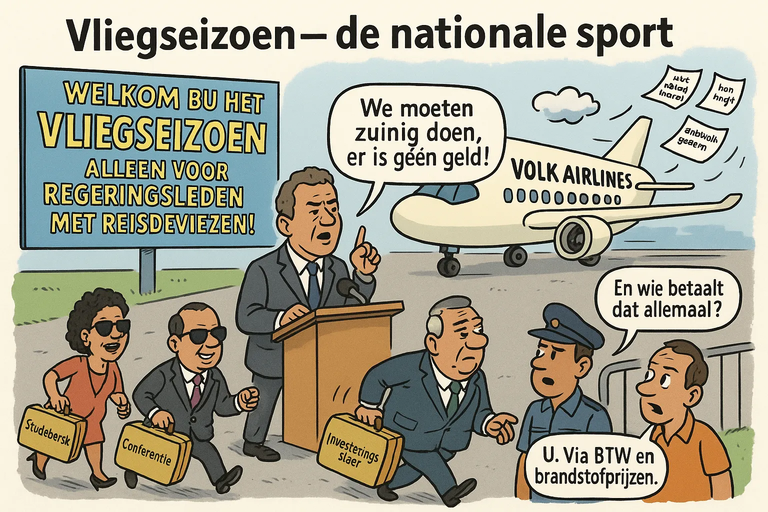 De nieuwe Surinaamse sport heet staatsvliegen: sluipend vertrek met zakken vol USD-reisdeviezen, keurig “voor officiële missie”. De bonnetjes? Die verdwijnen sneller dan de vliegtuigen zelf. Rapportage? Alleen als NOS ze toevallig filmt bij het hotelbuffet.