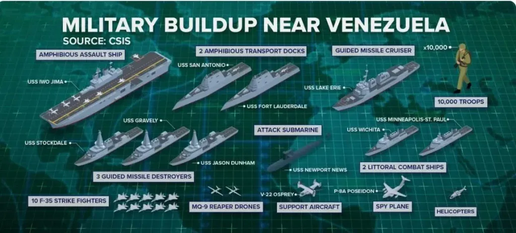 De Gerald Ford is het kroonjuweel van de Amerikaanse marine: een drijvende vesting op kernenergie, met duizenden manschappen, F-35 gevechtsvliegtuigen en het modernste katapultsysteem ter wereld. Rondom het kolossale schip varen acht oorlogsbodems, een nucleaire onderzeeër en ondersteunende schepen, waaronder de USS Gravely (DDG-107), uitgerust met Tomahawk-raketten en Aegis-radar — technologie bedoeld voor oorlog, niet voor patrouilles in de Caribische Zee.