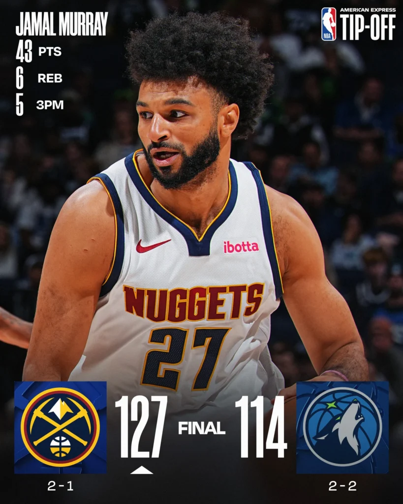 Nikola Jokić noteerde opnieuw een triple-double bij de winst van Denver op Minnesota (127-114).