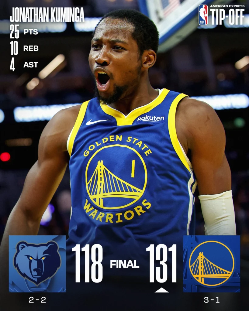 De Warriors versloegen Memphis (131-118) dankzij Jonathan Kuminga’s sterke optreden.