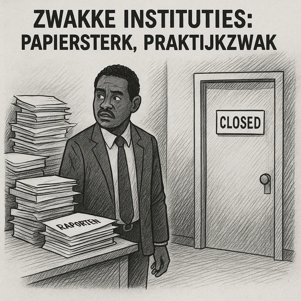 Suriname heeft wetten, regels en instellingen – maar te vaak alleen op papier. In de praktijk blijven rapporten ongelezen, aanbevelingen genegeerd en overtreders ongestraft. Van de Rekenkamer tot de Belastingdienst, veel overheidsorganen functioneren alsof ze bestaan om te bestaan. Ze schrijven verslagen, houden vergaderingen, maar durven zelden in te grijpen.