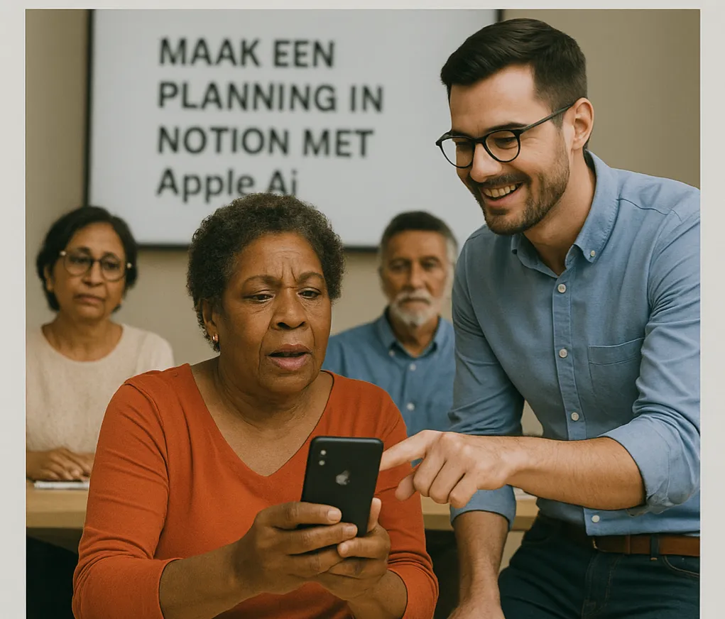 Toen kwam het moment van de waarheid: ”Maak een planning in Notion met AI”, instrueerde de trainer. Aha! eindelijk wat licht in de tunnel. Ik wist een klein beetje over AI. Ik typte “Maak een planning voor een digibete boomer die notion wil leren gebruiken”. Binnen seconden verscheen er een perfect AI schema op mijn telefoonscherm, compleet met koffiepauzes en tijd om bij te komen van mentale breakdowns.