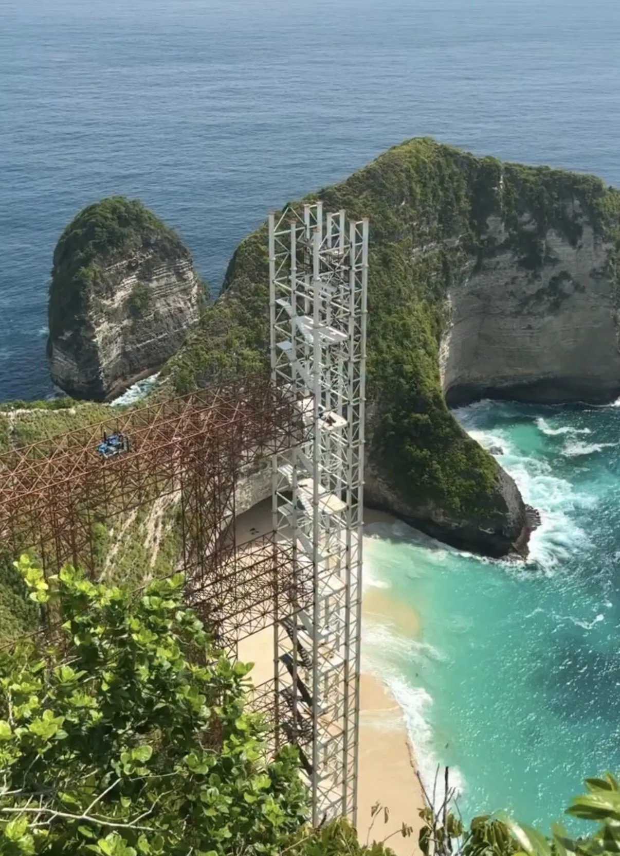 De bouw van een enorme glazen lift op een eiland bij Bali is stilgelegd door de lokale autoriteiten. De constructie van 182 meter hoog moet de top van een klif met het strand verbinden, maar leidt tot een golf van protest.