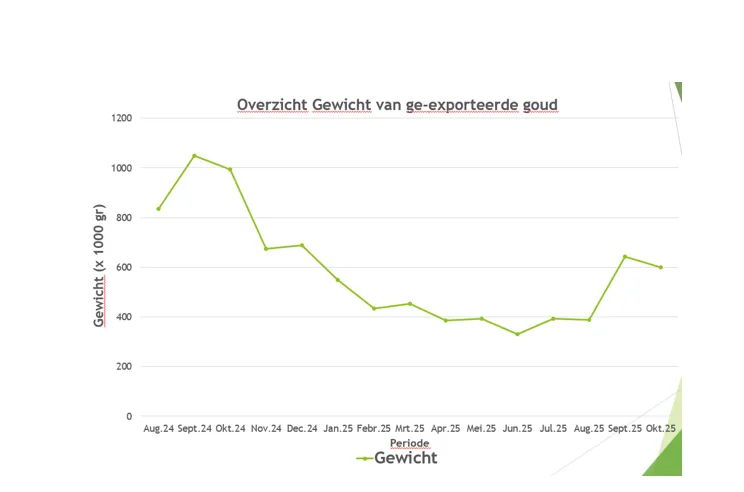 Na haast een jaar een sterk dalende trend te hebben vertoond zijn de goudexporten uit de kleinschalige goudsector (KGS) in september en oktober dit jaar weer gestegen. In september en oktober bedroegen de goudexporten uit de kleinschalige sector respectievelijk 642 kilogram en 598 kilogram. Vorig jaar september lag de goudexport nog op ruim 1000 kilogram, om vanaf toen maandelijks steeds te dalen. In januari 2025 is er nog geen 550 kilogram geƫxporteerd.