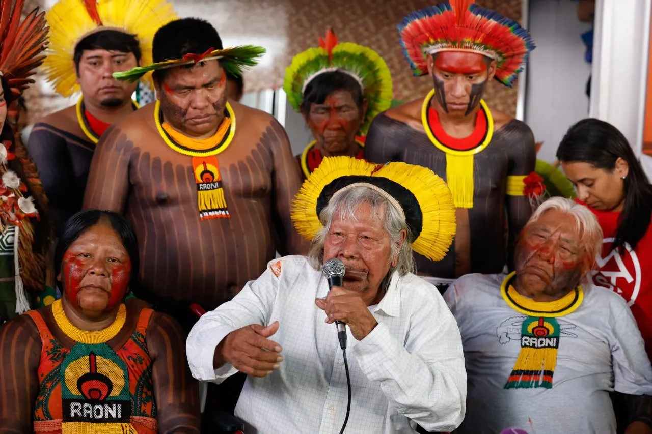 De 93-jarige inheemse leider Raoni Metuktire dringt er bij Brazilië op aan om inheemse volken in staat te stellen het Amazone-regenwoud te behouden.