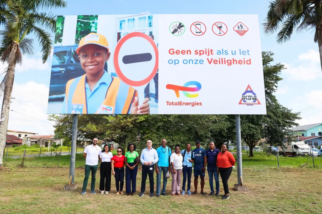 TotalEnergies EP Suriname heeft vandaag, vrijdag 14 november, een nieuw verkeersveiligheidsbillboard onthuld op de hoek van de Petunia- en Gladiolenstraat bij Zorg & Hoop.
