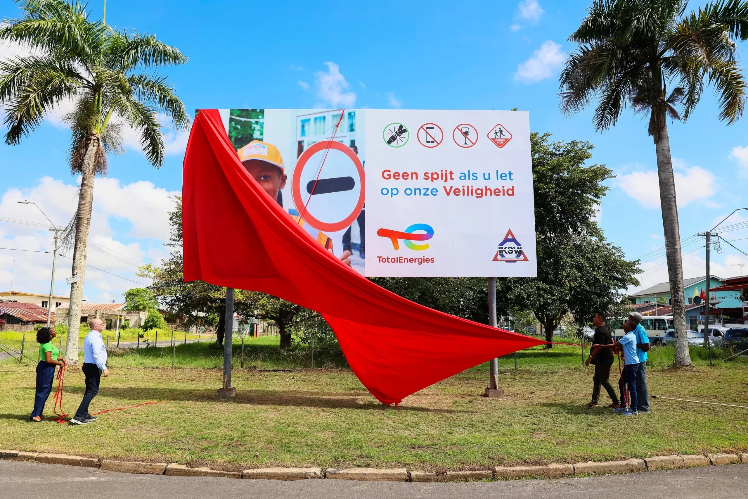 TotalEnergies EP Suriname heeft vandaag, vrijdag 14 november, een nieuw verkeersveiligheidsbillboard onthuld op de hoek van de Petunia- en Gladiolenstraat bij Zorg & Hoop.
