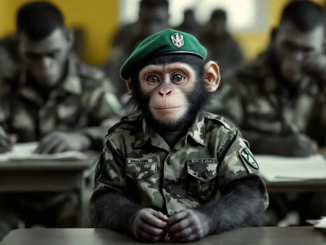 In Suriname kan politiek soms lijken op een klas vol soldaten die allemaal doen alsof ze weten wat ze doen — en precies daarom past dit plaatje perfect. Stel je voor: een kleine, onschuldige aap die alleen maar een paar grappen wilde posten op social media. Een meme hier, een steekje daar, een beetje “mi njang moni”-humor er bovenop… en BAM! De revolutie roept, en ineens zit hij vooraan als bevelhebber.
