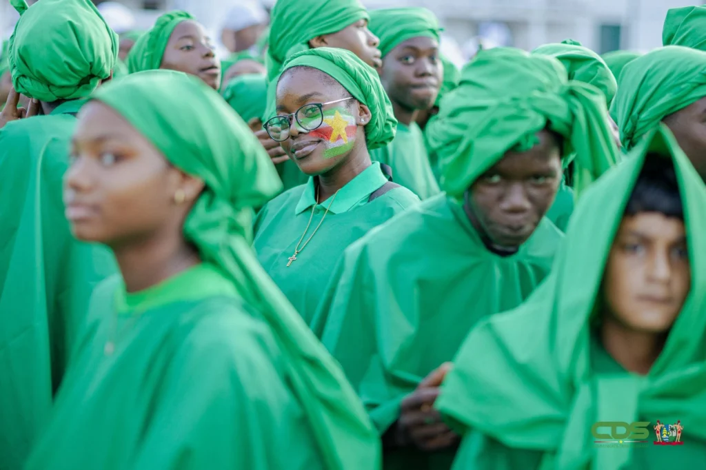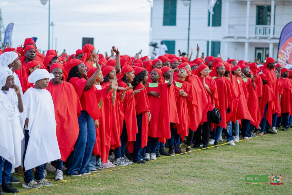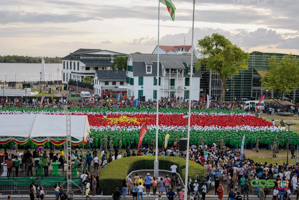 Onder toeziend oog van regeringsfunctionarissen vanaf het bordes van het presidentieel paleis en een enthousiaste menigte toeschouwers, kwamen ruim 7.500 jongeren van 45 scholen bijeen voor het grote moment van de Srefidensi gymnaestrade: het vormen van de Surinaamse vlag.