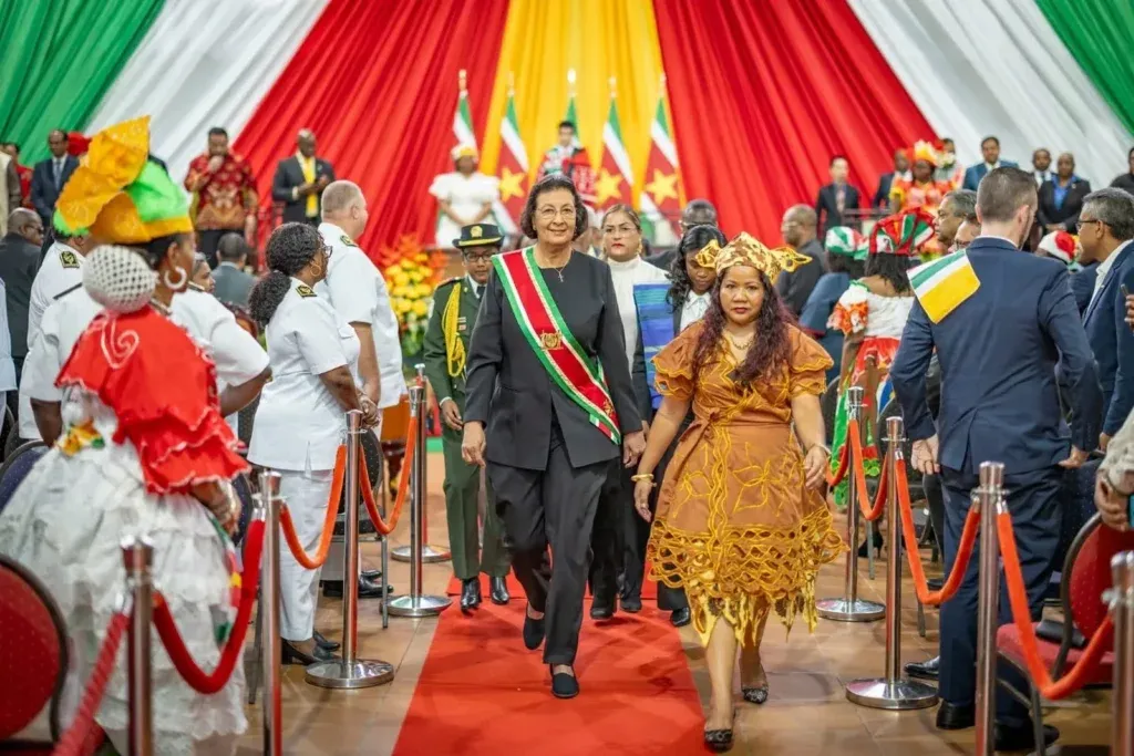 De foto’s ademen pure Surinaamse trots. Vrouwen in schitterende kotomisi-jurken dansen met een lach die het hele plein vult. President Jennifer Simons loopt waardig over de rode loper in de Congreshal – omgetoverd tot vergaderzaal van de Nationale Assemblee voor een speciale vergadering in verband met 50 jaar Staatkundige Onafhankelijkheid -, omringd door kleurrijke tradities en verwachtingsvolle blikken.