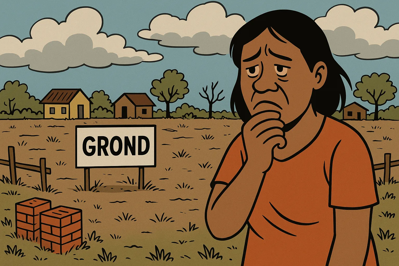 Kijk naar Mirella, een alleenstaande moeder van twee. Ze kreeg vijf jaar geleden een terrein in het district. Een moment van hoop – eindelijk een plek die van haar zou zijn. Ze plantte alvast een paar fruitboompjes, kocht een stapel bakstenen, droomde van een veranda waar haar kinderen zouden spelen. Maar bouwen bleek een luxe.