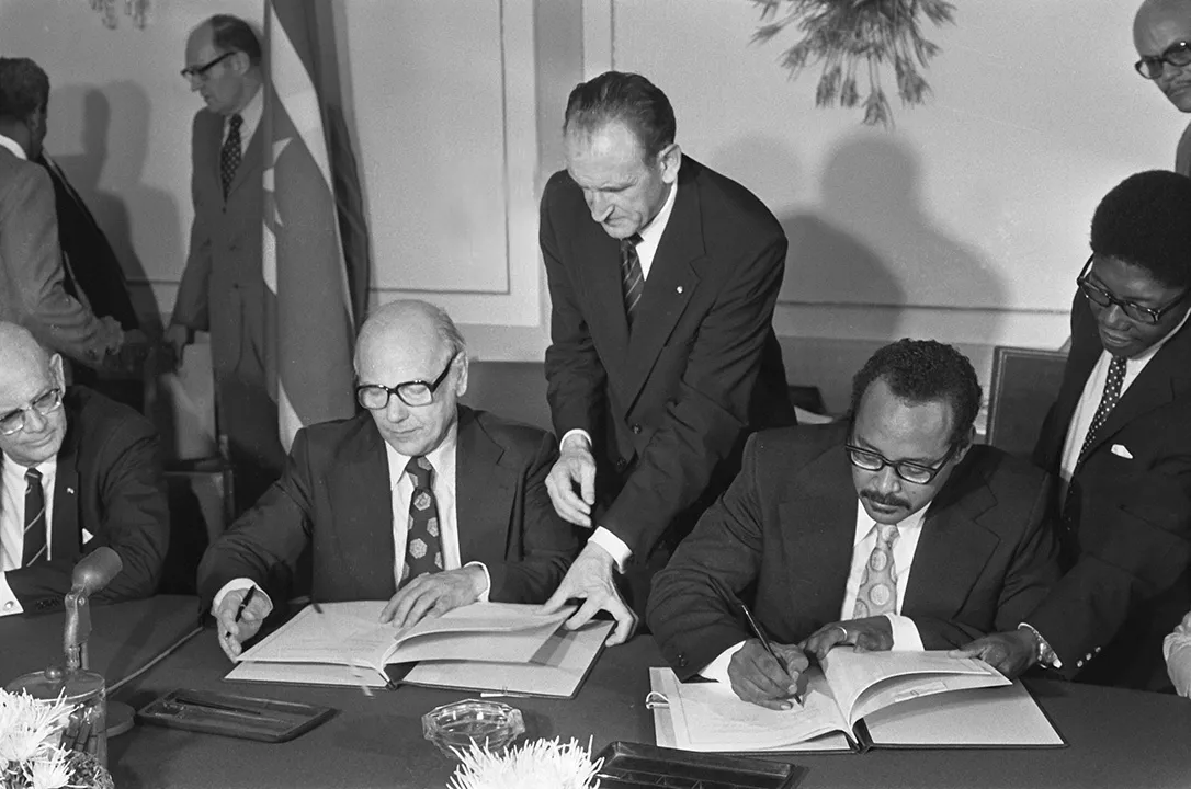 Gewezen gouverneur Ferrier werd beëdigd als president, terwijl in Den Haag koningin Juliana het soevereiniteitsverdrag tekende in het bijzijn van vicepremier Dries van Agt.