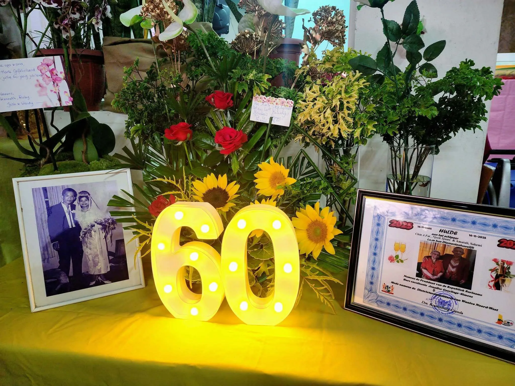 Het echtpaar Njoek Sjauw Chin A Fat (84) en Sakemi Amatali (82) vierde op 25 november hun diamantenhuwelijk met familie en vrienden.