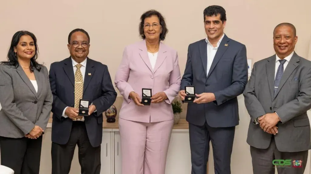 President Jennifer Simons heeft vrijdag 28 november de speciale 50 jaar Srefidensi-gedenkpenning in ontvangst genomen uit handen van Centrale Bank van Suriname-governor Maurice Roemer.
