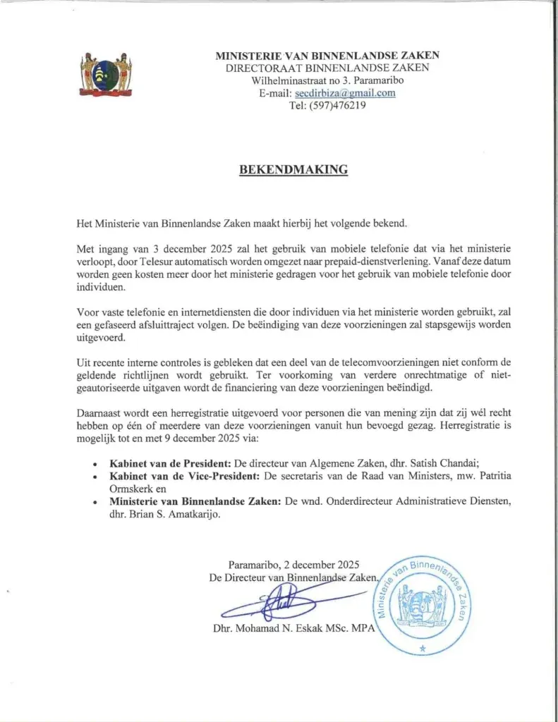 Het ministerie van Binnenlandse Zaken meldt dat alle mobiele telefoonaansluitingen die via het ministerie lopen, per 3 december automatisch worden omgezet naar prepaid door Telesur.