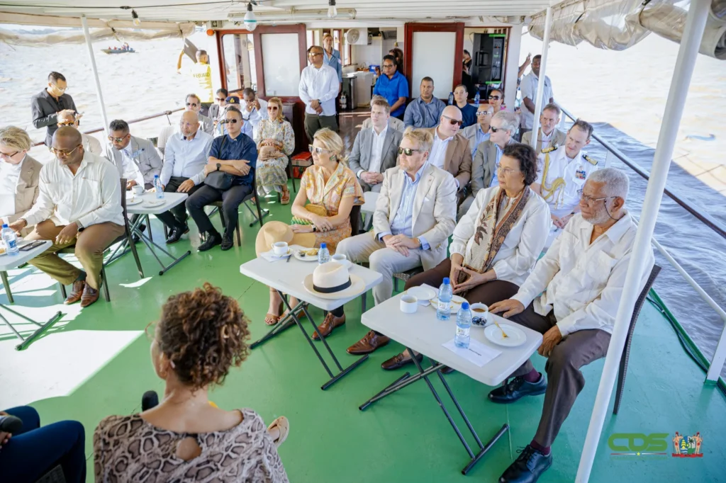 Aan boord van salonboot Mi Gudu ontvingen president Jennifer Simons en haar echtgenoot hen voor een informatieve tocht langs historische plantages.