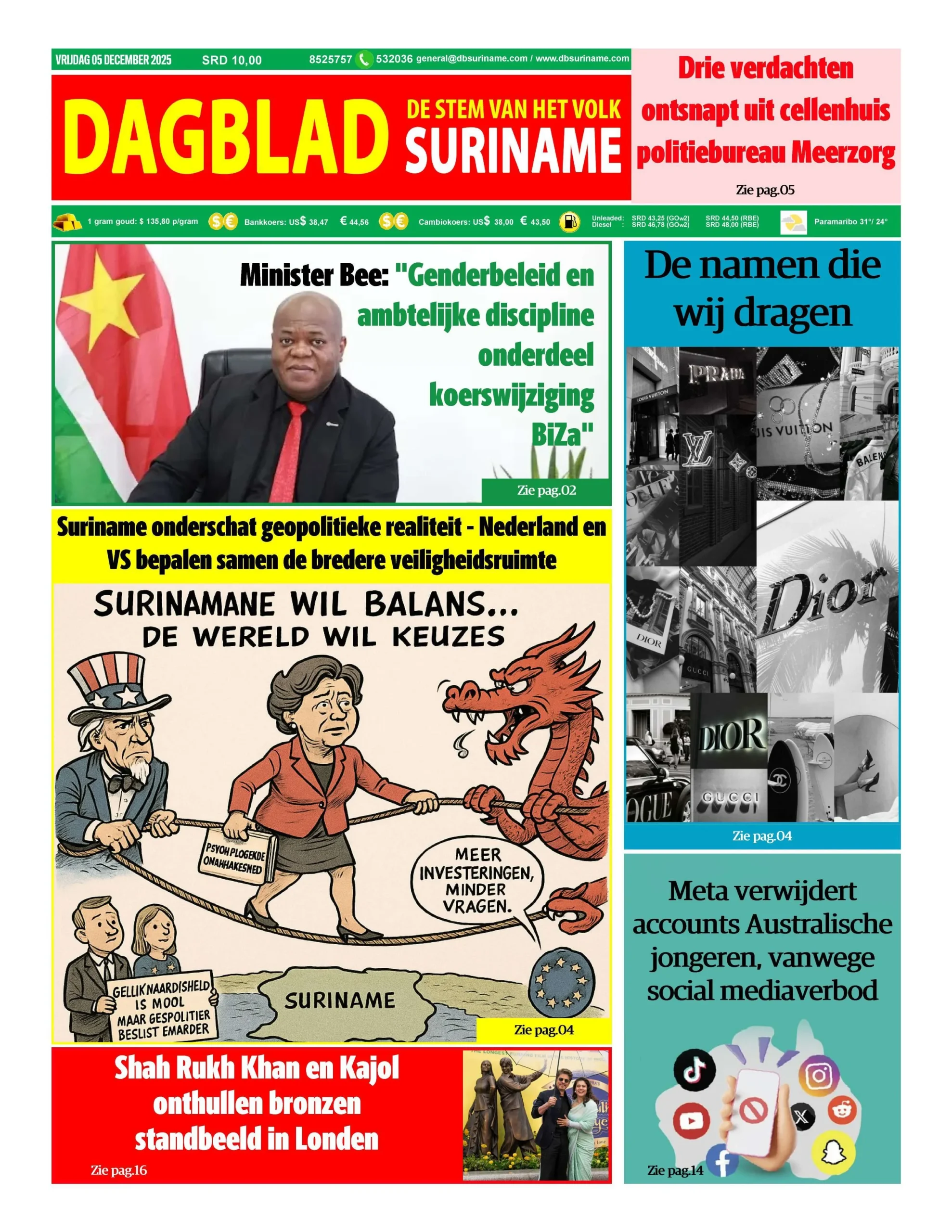 Dagblad Suriname, vrijdag 5 december 2025 Geplaatst op december 5, 2025december 4, 2025 Bericht navigatie VorigeMeerdere gewonden bij zware aanrijding twee auto’s op WayambowegVolgendePrijzen vrijdag 5 december 2025