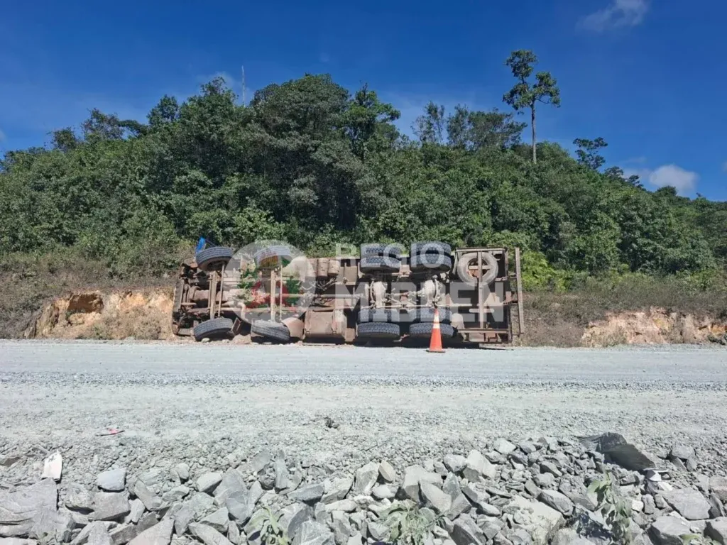Een vrachtwagen is zaterdagochtend 6 december op de weg naar Nieuw Koffiekamp gekanteld en op zijn zij langs de weg beland.