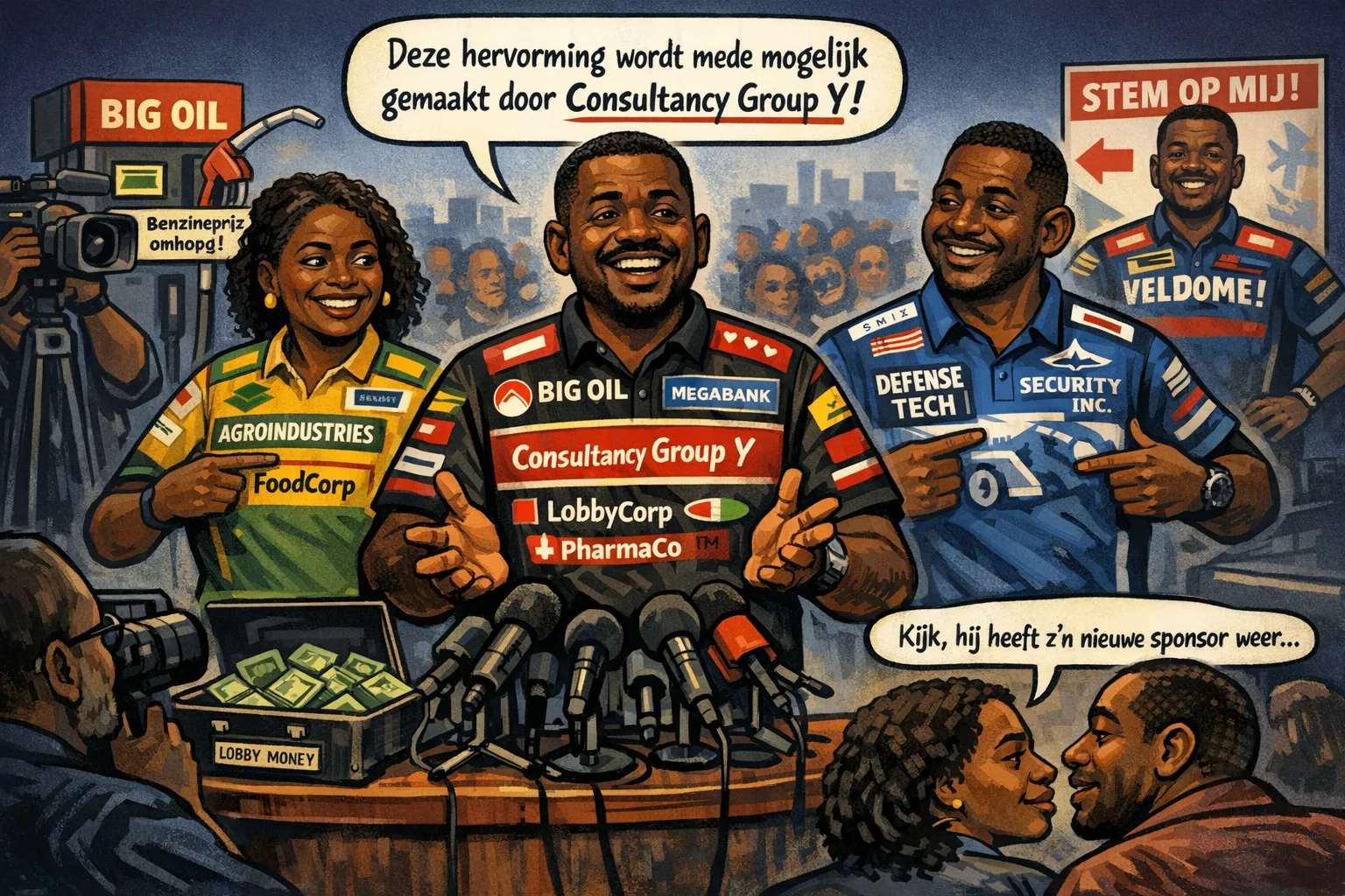 Bij persconferenties wordt het helemaal mooi. Politici bedanken hun sponsors na elke zin: âDeze hervorming â aangeboden door Consultancy Group Y â is goed voor het volk.â Bij verkiezingen winnen niet de beste ideeĂ«n, maar de grootste logoâs. Hoe meer patches op je shirt, hoe groter je âervaringâ.