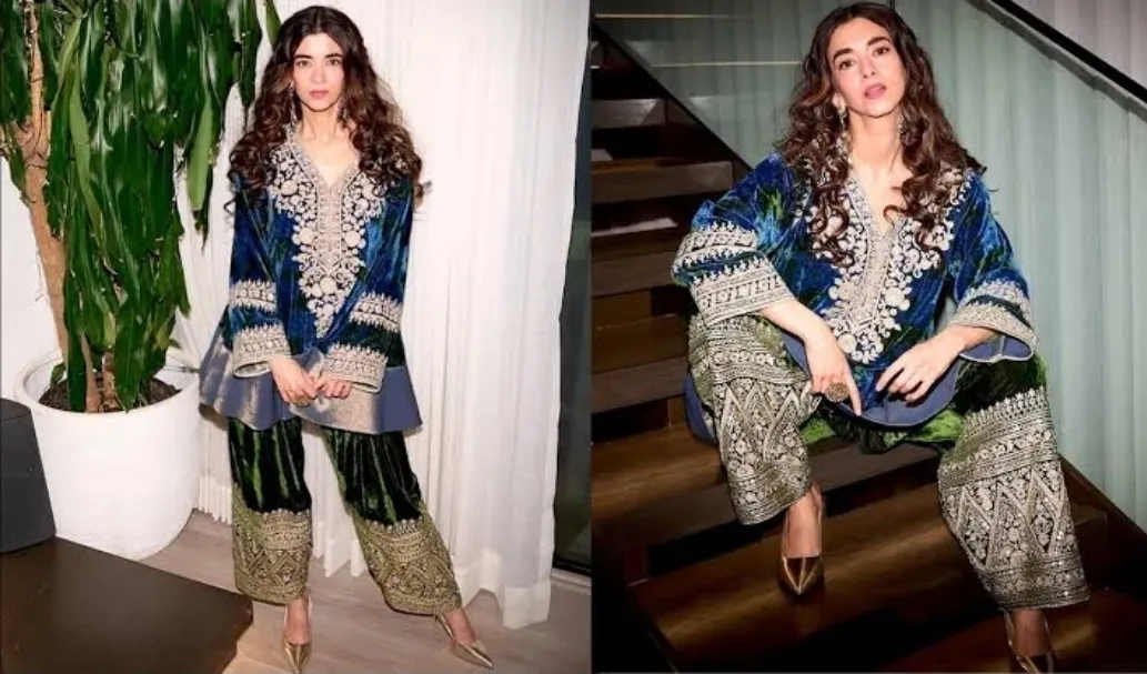 Saba Azad draagt een Heena Kochhar-ensemble dat velvet, goudborduursel en dhoti-stijl broek combineert met ongedwongen zelfvertrouwen.