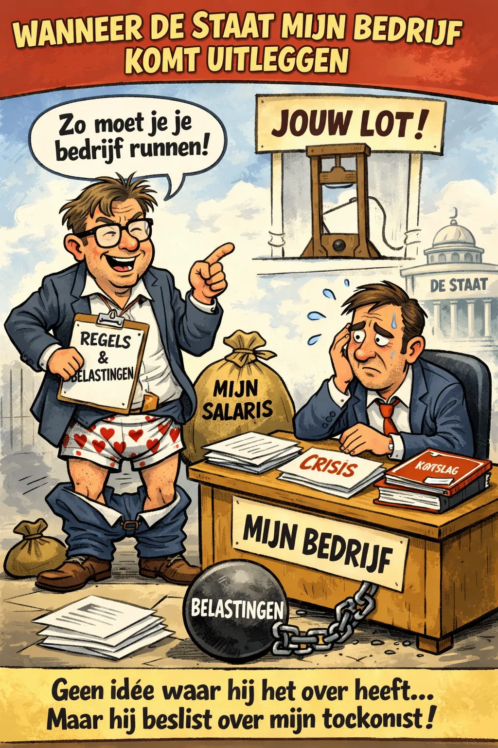 Terwijl ik risico’s neem, salarissen betaal en slapeloze nachten trotseer, leeft hij comfortabel van mijn belastinggeld. De staat als vaste werkgever, falen zonder gevolgen, en elke maand gegarandeerd salaris. Ondernemen zonder klanten, zonder concurrentie, zonder marktdruk—dat is pas luxe.