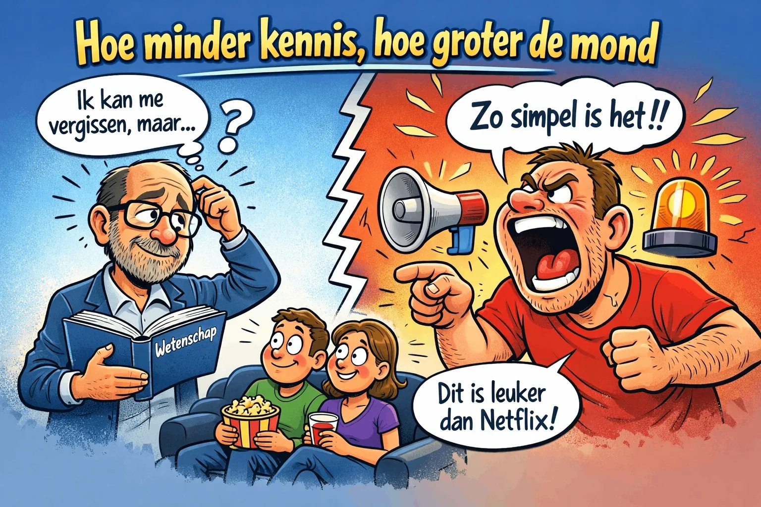 Aan de andere kant heb je het kamp van de absolute zekerheid. Mensen die weinig weten, weten dat zelf meestal niet. Zij spreken luid, stellig en zonder nuance. Complexe problemen worden in één zin opgelost, bij voorkeur met de woorden “zo simpel is het”. Twijfel zien ze als zwakte en kennis als overbodige ballast.