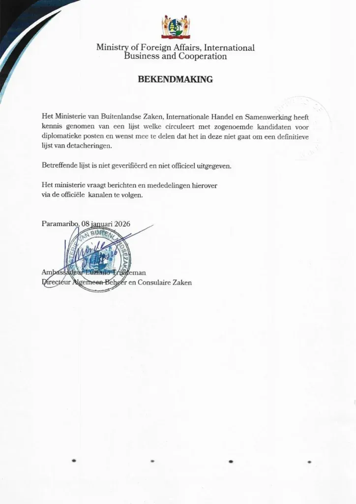Via social media circuleert een lijst met namen van personen die zogenaamd namens Suriname zouden worden gedetacheerd naar diplomatieke posten in het buitenland en daarmee als ambtenaren in buitendienst zouden optreden.