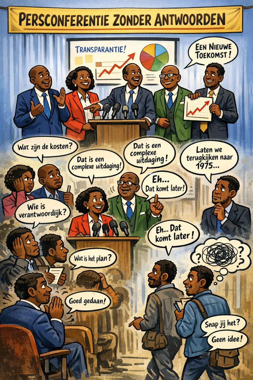 Het begon stipt op tijd, wat op zichzelf al nieuwswaardig was. Vijf leiders, zes microfoons en één PowerPoint-presentatie die meer kleur had dan inhoud. Vijfenveertig minuten lang vlogen de grote woorden door de zaal: transparantie, herstructurering, duurzame vooruitgang en natuurlijk een nieuw tijdperk. Grafieken stegen hoopvol omhoog, al wist niemand precies wat ze voorstelden.