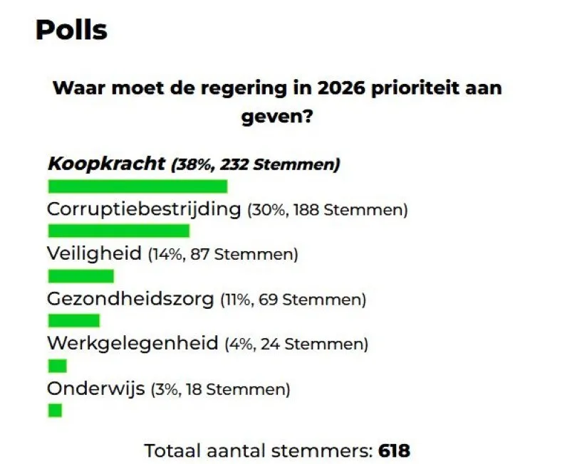 Een webpeiling van Dagblad Suriname laat zien waar volgens burgers de prioriteiten van de regering in 2026 moeten liggen. In totaal namen 618 bezoekers deel aan de online stemming. De meeste stemmen gingen naar koopkracht.
