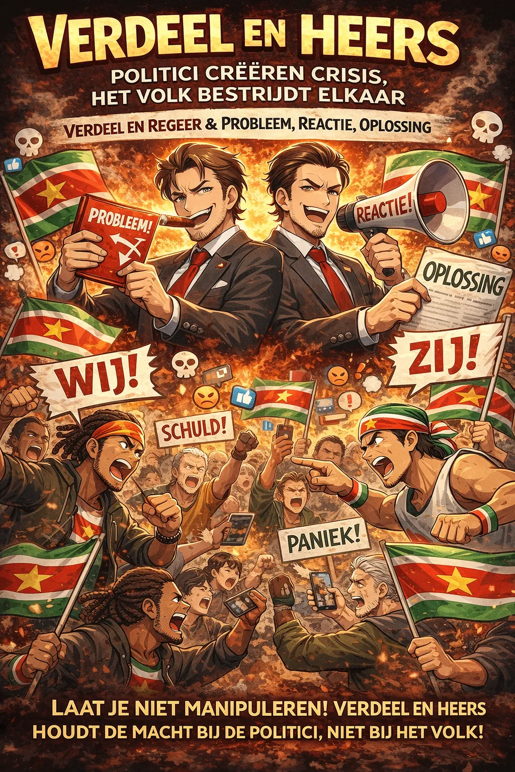 Verdeel en heers functioneert door groepen tegenover elkaar te zetten op basis van afkomst, inkomen, wijk of mening. De aandacht verschuift van beleid naar onderlinge ruzie. De Hegeliaanse methode verkoopt crisismanagement als daadkrachtig leiderschap. Wie vragen stelt, wordt weggezet als lastig, onwetend of ontrouw.