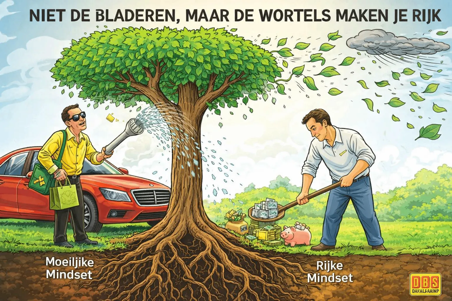 De rijke mindset werkt anders. Die richt zich eerst op de basis: een stabiel inkomen, spaargeld, investeringen en zo min mogelijk schulden. Dat zijn de wortels en de stam van de boom. Die zie je niet meteen, maar ze zorgen ervoor dat de boom blijft staan, ook tijdens een storm.