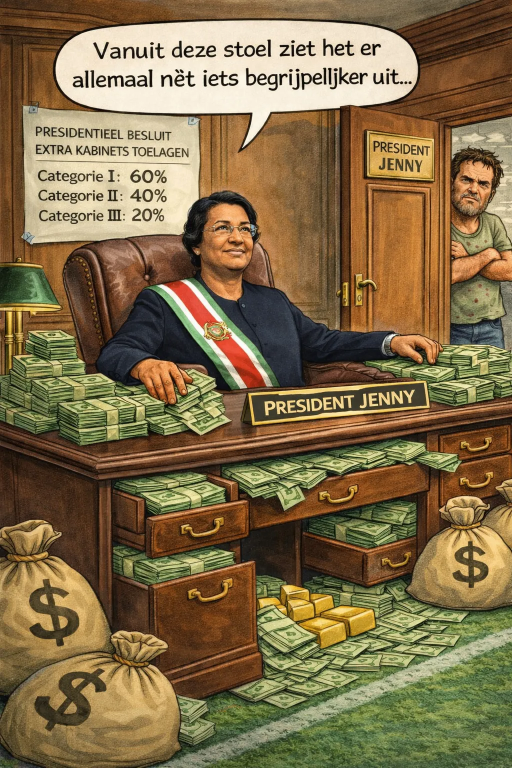 In een land waar de meeste burgers elke maand opnieuw moeten rekenen en schrappen, klinkt het woord toelage als een vloek. De recente besluiten rond extra kabinetstoelagen hebben dat gevoel verder aangescherpt. Terwijl burgers een eenmalige SRD 1.000 ontvangen en geacht worden daar dankbaar voor te zijn, lezen zij in officiële stukken percentages van 20, 40 en zelfs 60 procent extra bovenop salarissen van medewerkers van het kabinet van de president.