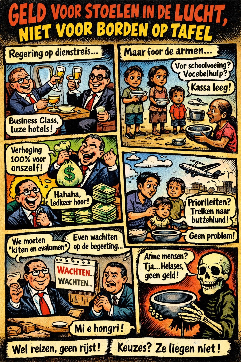 Tickets businessclass, dagvergoedingen, hotels met uitzicht op niets dat de honger in Paramaribo kent. Dat geld is er altijd. Net als het geld om zichzelf verhogingen toe te kennen die elke economische logica tarten, honderden procenten tegelijk, goedgekeurd in vergaderingen waar armoede slechts een statistiek is.