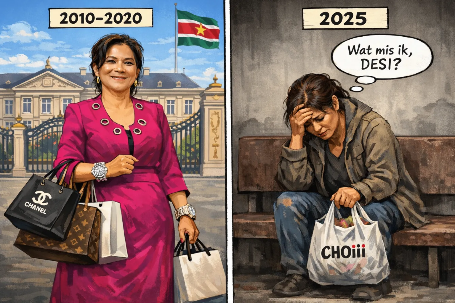 Twee momenten tonen dezelfde persoon in totaal verschillende werkelijkheden. Eerst de nabijheid van het paleis, omgeven door luxe, status en politieke bescherming. Daarna de bank, de supermarkt tas en de vraag die resteert.