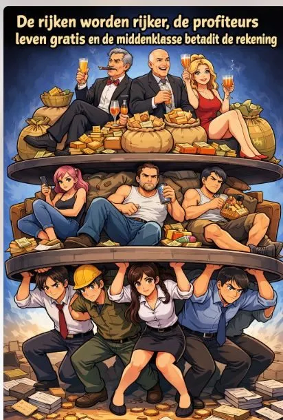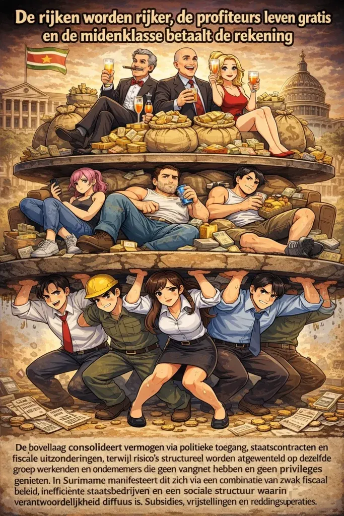 “De rijken worden rijker, de luien leven gratis en de middenklasse betaalt alles.” Deze zin vat in één klap een realiteit samen die ook in Suriname steeds zichtbaarder wordt. De bovenlaag consolideert vermogen via politieke toegang, staatscontracten en fiscale uitzonderingen, terwijl risico’s structureel worden afgewenteld op dezelfde groep werkenden en ondernemers die geen vangnet hebben en geen privileges genieten.