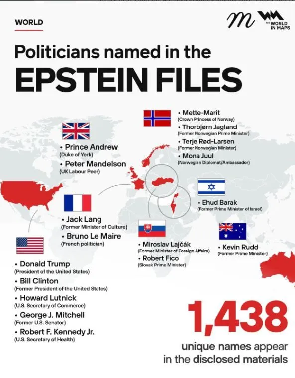 In Europa worden figuren genoemd uit Frankrijk, Noorwegen, Slowakije en het Verenigd Koninkrijk, variërend van royalty en oud-premiers tot diplomaten en ministers. Ook Israël en Australië zijn vertegenwoordigd via voormalige regeringsleiders. In totaal komen meer dan duizend unieke namen voor; vermelding impliceert geen schuld, maar weerspiegelt de omvang van Epsteins netwerk.