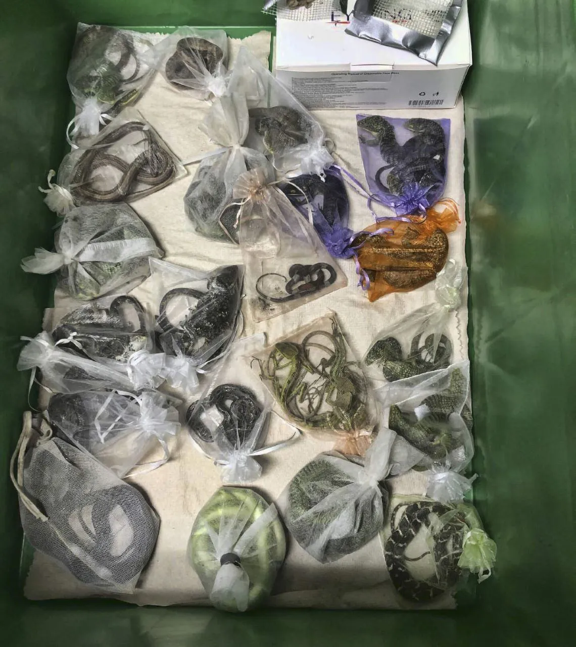 De dieren zaten in linnen zakken die op hun beurt waren verstopt in zakken popcorn, koekjesdozen en een handtas, en vervolgens in kartonnen dozen waren geplaatst.