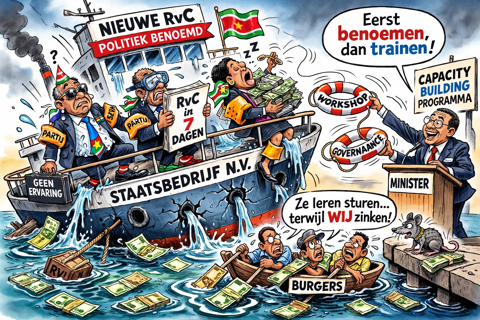 Minister Raymond Landveld van Transport, Communicatie en Toerisme stelde dat wanneer nieuw benoemde leden van Raden  van Commissarissen onvoldoende expertise hebben, de overheid eventueel aan capacity-building zal doen. Dat klinkt geruststellend, alsof een spoedcursus toezicht houden hetzelfde is als jarenlange ervaring in financieel bestuur. De impliciete boodschap is duidelijker dan bedoeld: men weet dat politieke voordrachten niet altijd op vakbekwaamheid zijn gebaseerd.