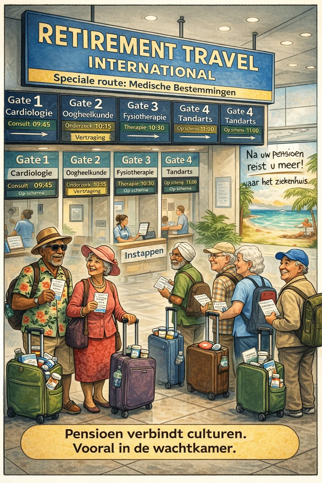 Ze zeggen dat je na je pensioen meer gaat reizen. Wat ze er niet bij vertellen, is dat die reizen meestal eindigen in een wachtkamer met tl-verlichting en een tijdschrift uit 2014.