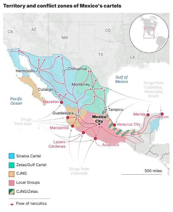 Mexico’s positie als belangrijke doorvoerhaven in de wereldwijde drugshandel voedt dit geweld. Het CJNG profiteerde van drugroutes door cocaïne uit Zuid-Amerika, synthetische drugs zoals fentanyl en in eigen land geproduceerde methamfetamine naar de Verenigde Staten en andere bestemmingen te smokkelen.